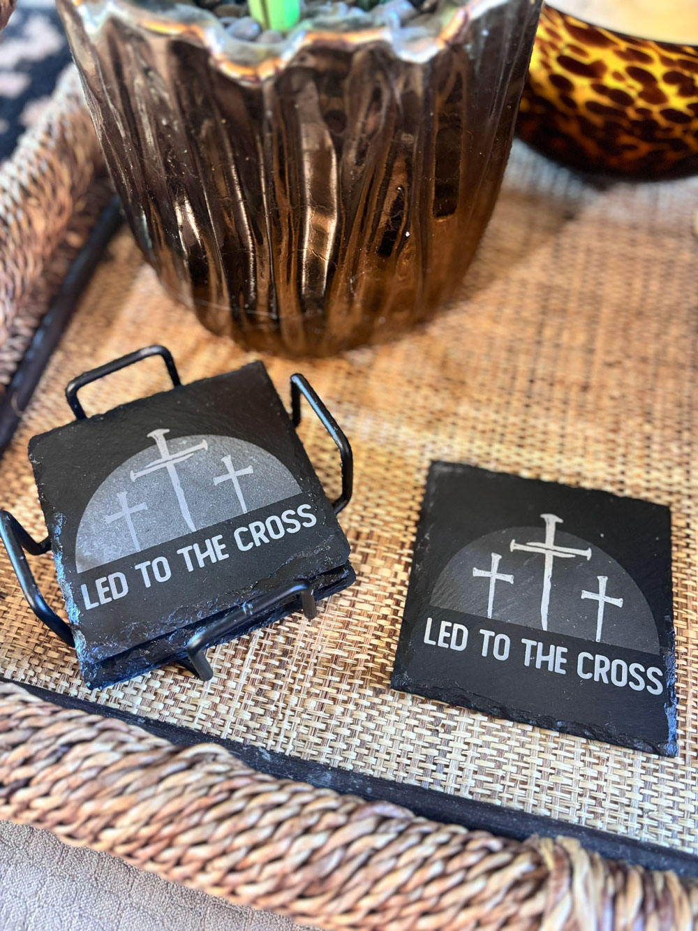 Add faith and style to your home with these Led To The Cross slate coasters. Crafted from natural stone, each coaster features a beautifully etched design, one with the signature three-cross logo and another engraved with Isaiah 41:10:
